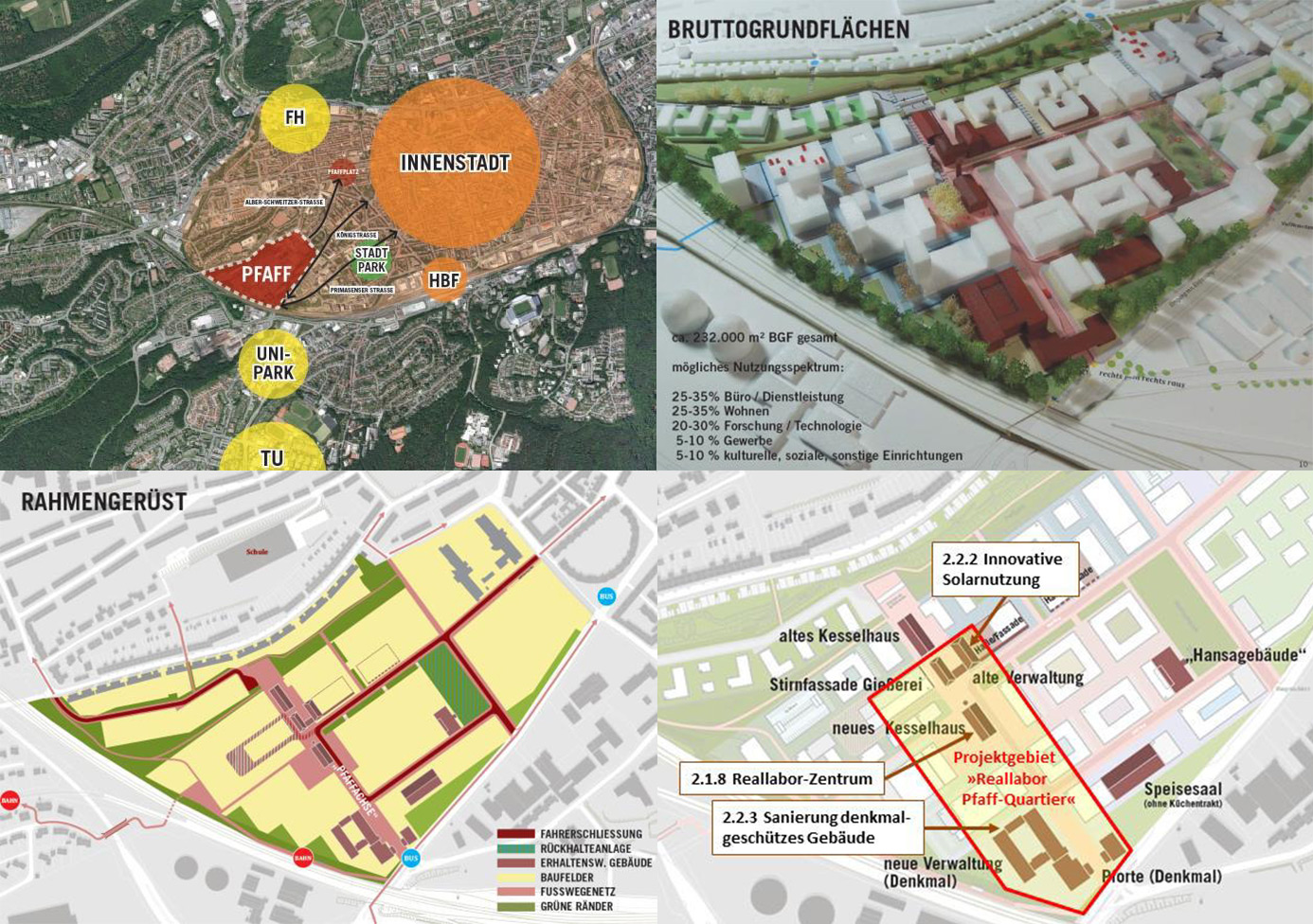 Auf Basis des erarbeiteten Gesamtkonzeptes für den Endausbau des Quartiers wird für die erste Entwicklungsphase im Rahmen des Projektes bis zum Jahr 2022 auf einem ca. 3,5 ha großen Teilgebiet das Pfaff-Quartier Reallabor entwickelt und umgesetzt mit Planung und Realisierung von leistungsfähigen und innovativen Infrastrukturen für Strom, Wärme, Kälte, E-Mobilität und Daten sowie der Sanierung von 3 bestehenden Gebäuden mit innovativen Technologien. Im ehemaligen Kesselhaus in zentraler Lage wird das Reallabor-Zentrum eingerichtet, das den physischen Raum bietet für eine Reallabor-Werkstatt, in der technologische Planungen und Lösungen sichtbar gemacht und mit den betroffenen Akteuren (Nutzer und Bewohner, Fachplaner und Investoren, Forscher und Verwaltung) gemeinsam diskutiert und in Co-Design- und Co-Creation-Prozessen optimiert werden. Als nationaler Leuchtturm verfolgt das Reallabor Pfaff-Quartier das Ziel, Bevölkerung und Fachbesucher aus der Stadt Kaiserslautern, dem Land Rheinland-Pfalz und aus Deutschland sowie internationale Besucher allgemeinverständlich über das Projekt und die geplanten und umgesetzten Lösungen und die erzielten Ergebnisse zu informieren. Hierfür ist im Reallabor-Zentrum eine interaktive Ausstellung geplant, die u.a. mit Virtual Reality Technologien die erwartete zukünftige Entwicklung sichtbar und erfahrbar macht.
