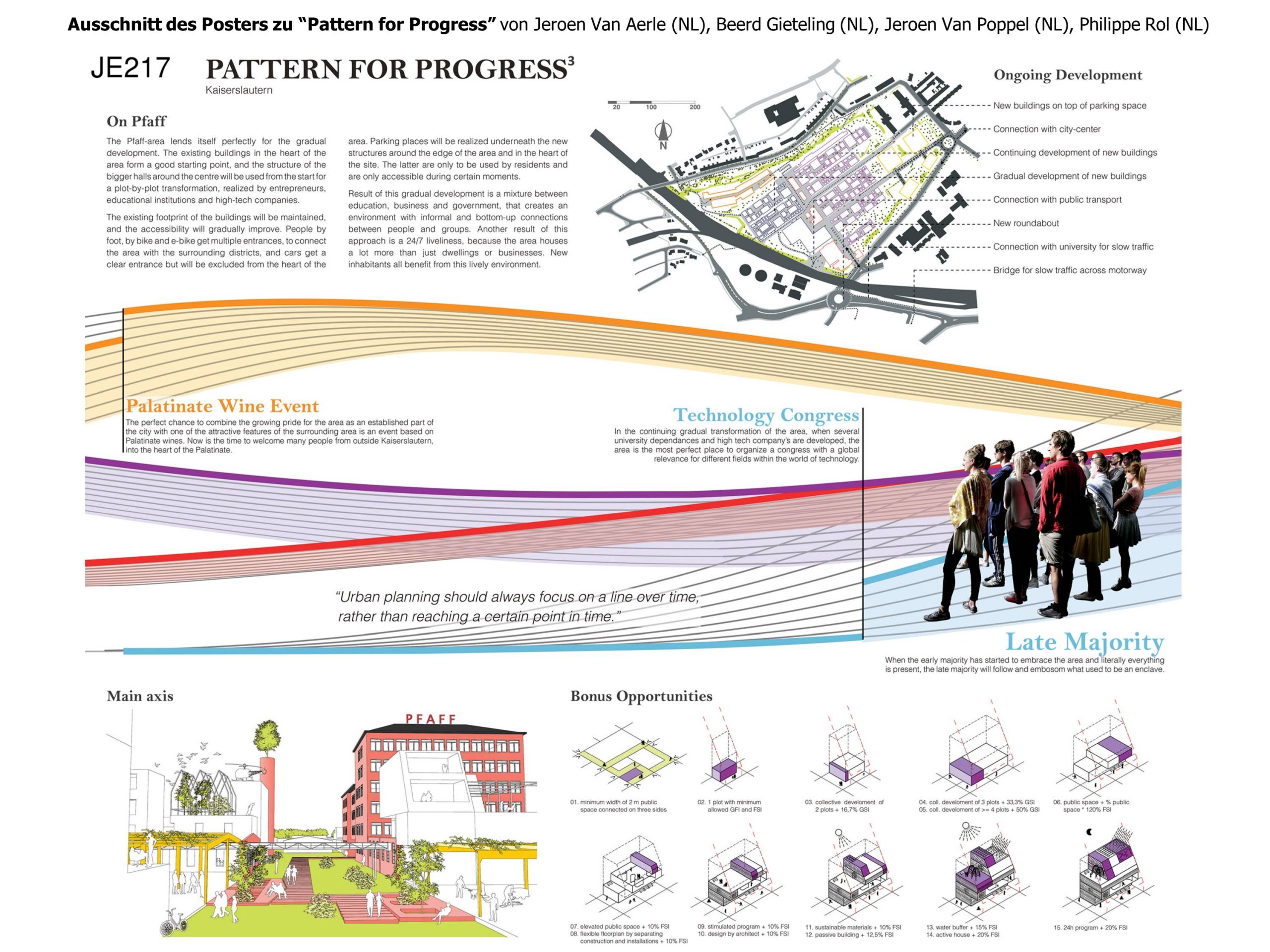 Den Preis gewinnt Pattern for Progress von Jeroen Van Aerle (NL), Beerd Gieteling (NL), Jeroen Van Poppel (NL), Philippe Rol (NL). Im Bericht der Jury heißt es: Das Projekt reicht weit über das reguläre Spektrum einer städtebaulichen Arbeit hinaus. Es bietet keine fertige Lösung, sondern beschreibt einen Entwicklungsprozess, dessen Ansatz zu exemplarischem Arbeiten und zum Beschreiten neuer Wege auffordert. Dabei werden alle Beteiligten aktiviert, Bewegung, Veränderung und Entwicklung werden initiiert...