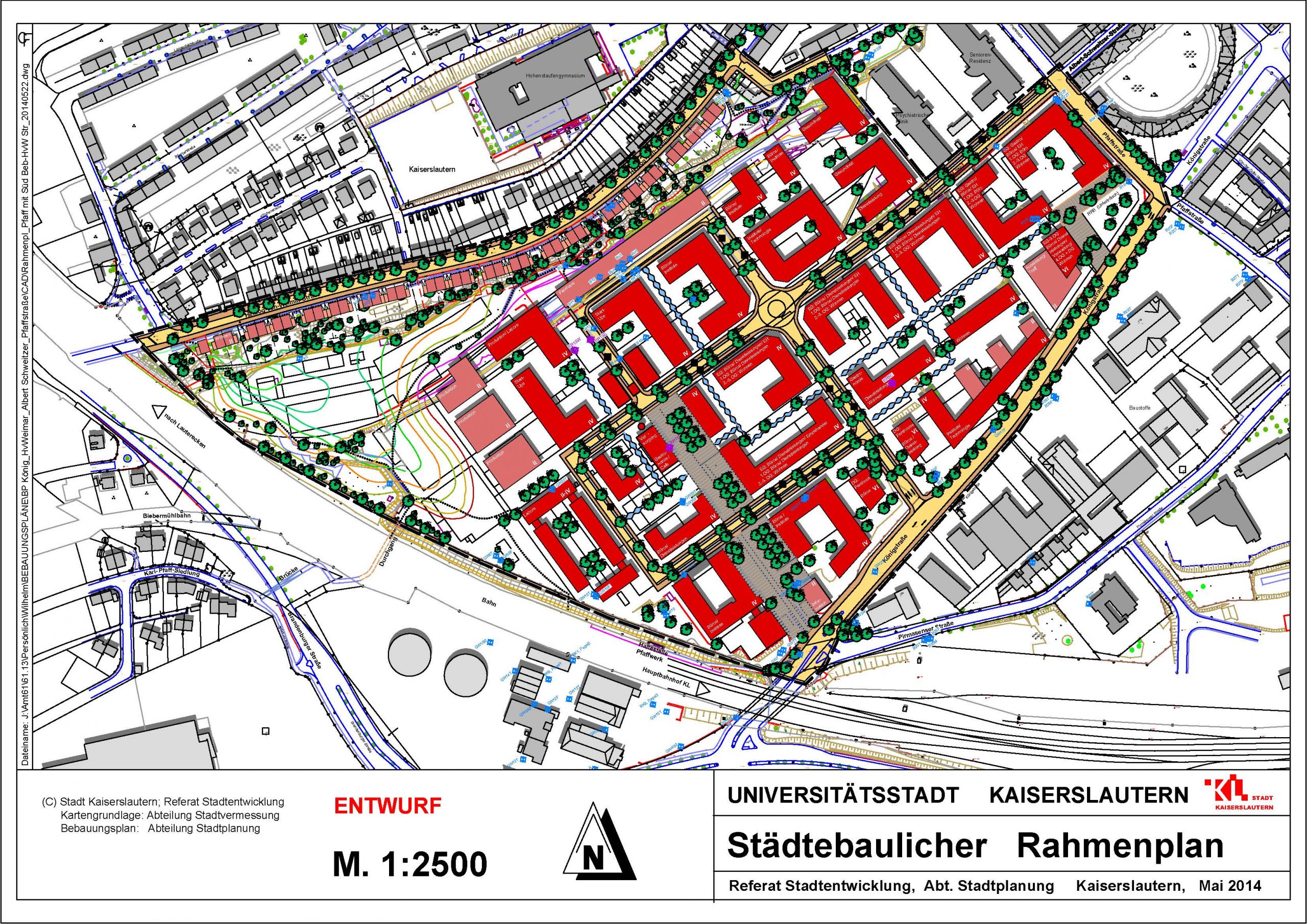 Im Juli 2014 beschließt der Stadtrat Kaiserslautern den von der Stadtplanung erstellten städtebaulichen Rahmenplan mit flexiblen Baufenstern für unterschiedliche Nutzer und Nutzungen, einer Raumkante zur Königstraße und Betonung der "Pfaff-Achse".